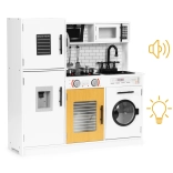 Ta stilska otroška kuhinjica v belo-lesenem dizajnu zvesto posnema pravo kuhinjo. Zahvaljujoč svetlečim kuhalnim ploščam in zvokom kuhanja po pritisku rdečih gumbov je igra še bolj privlačna. Odpirajoča se vratca na hladilniku, pečici, mikrovalovni pečici in pralnem stroju, vrtljivi gumbi štedilnika ter “dispenzer vode” z mehurčkajočim zvokom podpirajo realistične igralne scenarije.