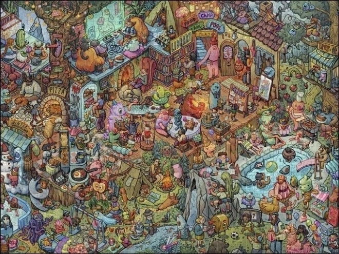 Ta komplet sestavljanke prinaša podrobno, z duhovitostjo prežeto sceno „zabava s prijatelji“, ki bo razveselila vsakega ljubitelja humornih ilustracij. Natančni izrezi, žive barve in kakovosten tisk zagotavljajo, da posamezni deli trdno sodijo skupaj, končni rezultat pa je videti odlično tudi od blizu.