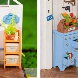 Notranjost modela je bogato opremljena z miniaturnim pohištvom, rastlinami in dodatki, zaradi česar je idealen dekorativni predmet za vaš dom.