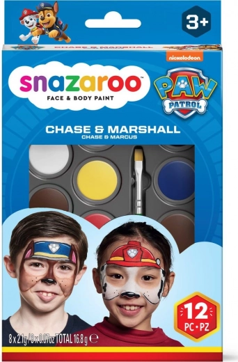 Odkrijte zabavo z licenčnim kompletom za poslikavo obraza in telesa Snazaroo za oboževalce Tačk na patrulji. Vsebuje 8 intenzivnih barv, čopič, gobice, šablono in slikovni priročnik za ustvarjanje mask Chase in Marshall. Barve so varne, netoksične, primerne tudi za občutljivo kožo, enostavne za nanašanje in odstranjevanje z vodo in milom – idealne za otroške zabave, pust in Noč čarovnic.
