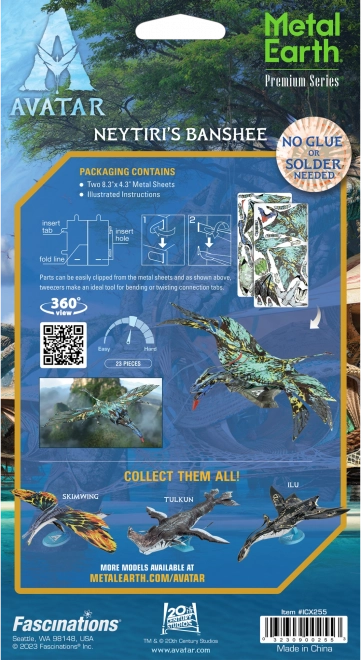 Premium serija METAL EARTH prinaša uradno licenciran model Neytirijinega Bansheeja iz filma AVATAR. Iz ploščatih jeklenih plošč z uporabo pametnih zaskočnih spojev nastane tridimenzionalna miniatura z bogatimi detajli in izrazito površino zaradi finega laserskega graviranja. Idealno kot zbirateljski model, dizajnerska dekoracija ali darilo za oboževalce filma.