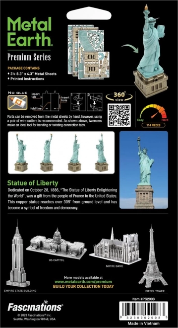 Uživajte v edinstveni izkušnji sestavljanja realistične replike Kipa svobode iz kovine. Iz tankih jeklenih ploščic nastane zahvaljujoč laserskemu graviranju verno izdelan model z drobnimi detajli krone, bakle in podstavka. Končni model bo izrazit oblikovalski dodatek vašemu interierju.
