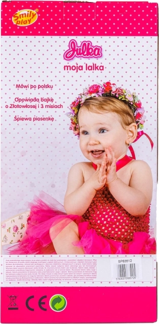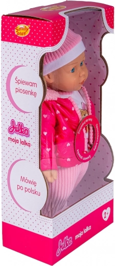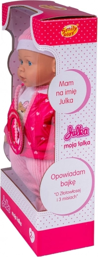 Punčka Julka uživa, ko skrbite zanjo in jo peljete na sprehod. Mehka punčka je oblečena v kapo, šal, pajac s črtastimi hlačami ter rožnato prešito jakno s kapuco, obrobljeno s črtasto tkanino v barvi hlač.