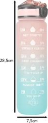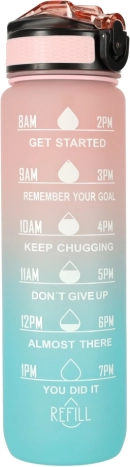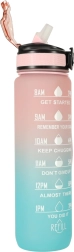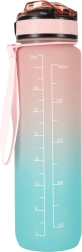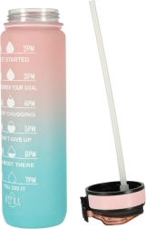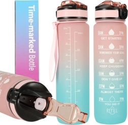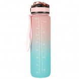 Stilska 1‑litrska Tritan steklenica s prelivom rožnata–modra pomaga ohranjati redno hidracijo zahvaljujoč motivacijskim časovnim oznakam. Ima preklopni pokrov z varnostno zaporo, integrirano slamico za udobno pitje brez nagibanja in lahek, trpežen material brez BPA.