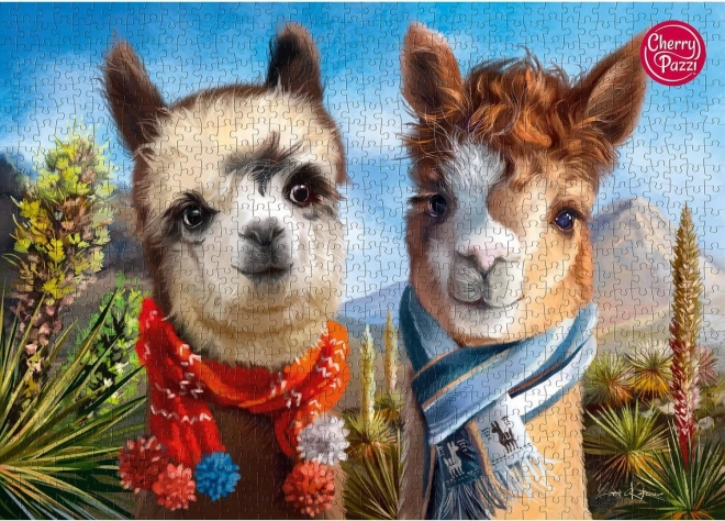 Vesela dvojica alpak v barvitih šalih na gorskem ozadju bo vaš dom napolnila s pozitivno energijo in motivacijo, da sestavljanko dokončate.