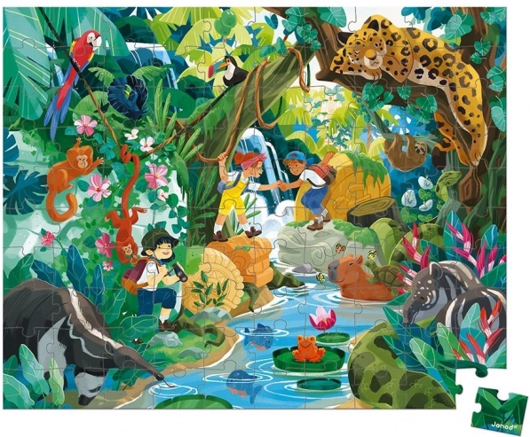 Odkrijte zabavno sestavljanko v kovčku z motivom džungle znamke JANOD. Komplet vsebuje 100 kosov, ki po sestavljanju ustvarijo barvito sceno s skritim templjem. Otroci med sestavljanjem razvijajo logično razmišljanje, pozornost, spomin in fino motoriko. Praktičen kovček z blagajnatim ročajem ter priložen plakat kot predloga olajšata sestavljanje doma in na poti.