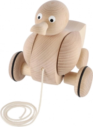 Ta klasična vlečna igrača je izdelana iz naravnega lesa in zasnovana za varno ter zabavno igro. Raček se med vožnjo prikupno premika in pomika z glavo, s čimer otroke spodbuja k nadaljnjim korakom in raziskovanju. Odlikujeta ga trdna konstrukcija in gladki robovi za udoben oprijem majhnih rok.