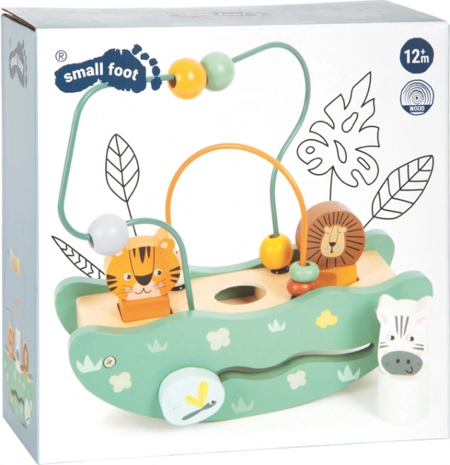 Lesena igrača s safari motivom vključuje pisane kroglice in živalske figurice leva, tigra in zebre za igrivo učenje.