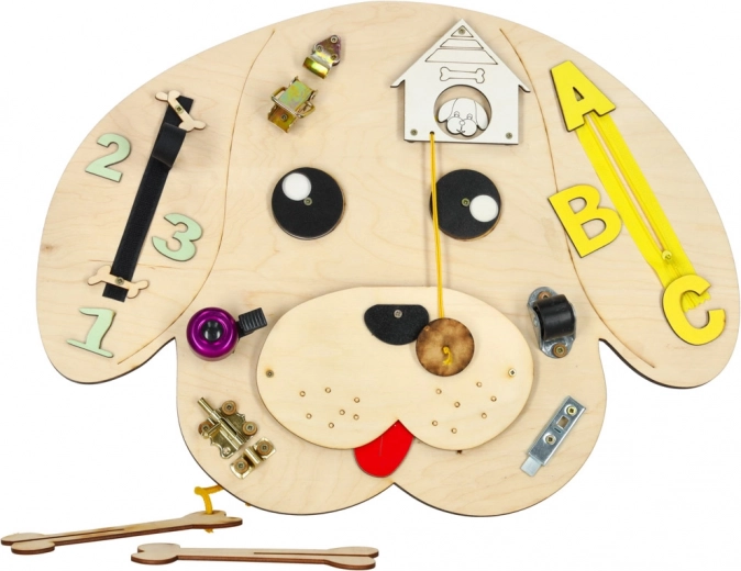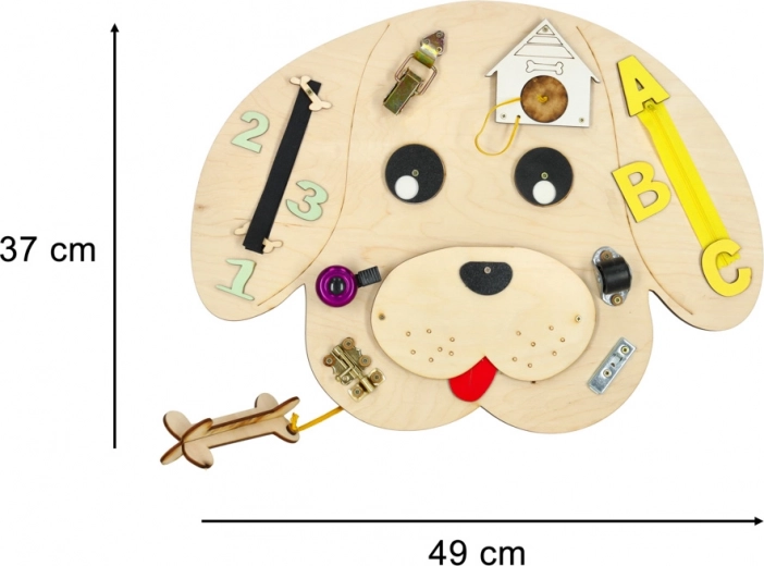 Zabaven lesen interaktivni panel v obliki psa razvija pri otrocih fino motoriko, logično mišljenje in osredotočenost. Vsebuje barvne lesene številke in črke, zadrgo, zaponke in zapah, zvonček ter druge interaktivne elemente, ki spodbujajo učenje skozi igro in senzorični razvoj.