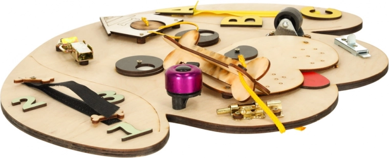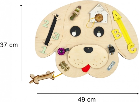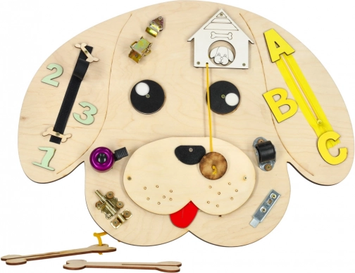 Ta prikupna aktivnostna deska v obliki pasje glave je zasnovana za varno raziskovanje in vsakodnevni trening spretnosti. Otroci vadijo prijem, koordinacijo oko–roka in potrpežljivost pri upravljanju z različnimi zapirali, zadrgo ali zvončkom. Barvne črke in številke dodatno naravno podpirajo prvo spoznavanje abecede in računanja.