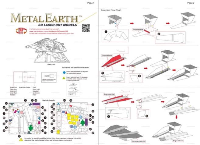 Posamezne dele odstranite iz kovinskih plošč; po potrebi uporabite majhne ščipalne klešče (niso priložene). Deli se med seboj spajajo s pomočjo zatičev, ki jih tvorita jeziček in odprtina. Jeziček upognite z majhnimi, tankimi kleščami (niso priložene) in postopoma povežite vse zatiče, dokler ne nastane zelo realističen mojstrski izdelek!