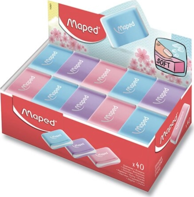 Mehka šolska radirka Maped z ergonomsko obliko za udoben oprijem v otroški roki. Vesel potisk smeškotov in mešanica barv popestrita vsako brisanje. Kompaktna velikost približno 3,5 × 2,5 × 1,5 cm. Fotografije so ilustrativne; barva glede na razpoložljivost na zalogi.