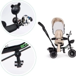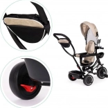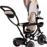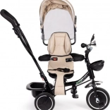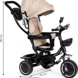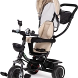 Varen tricikel z vodilno palico in strešico za otroke od 12 mesecev. Tricikel je možno uporabljati kot voziček, pri katerem lahko otroka potiskate z vodilno palico. Otroške noge so pri tem nameščene na varnostnih stopničkah. Prednosti tricikla: • vrtljiv sedež za 360° • zaklep krmila • varnostna zavora • zložljiva strešica in naslon za noge • mehko oblazinjen sedež • varnostni pasovi • košarica na krmilu in na vodilni palici • masivna, ojačana konstrukcija • trpežne pnevmatike Tehnične specifikacije: • dolžina tricikla: 84 cm • višina vodilne palice: 96 cm • razdalja med zadnjima kolesoma: 49 cm • premer sprednjega kolesa: cca 30 cm • premer zadnjih koles: cca 24 cm • nosilnost: 25 kg