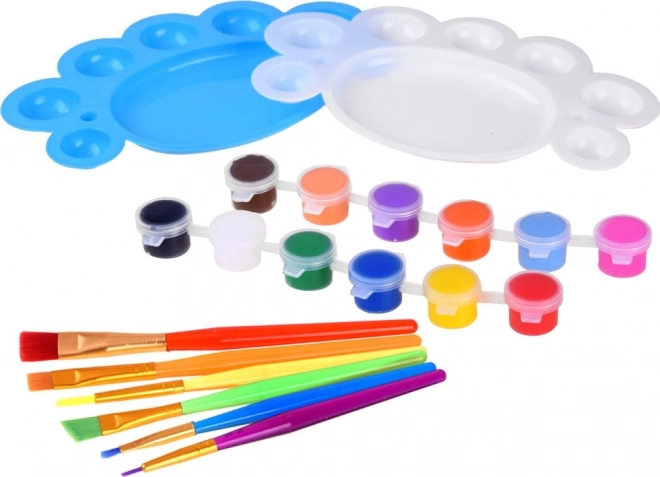 Razveselite svoje otroke s kreativnim slikarskim setom, ki vsebuje vse potrebno! V kompletu najdete 12 barv, 2 paleti za mešanje barv, čopiče različne debeline, valjčke za ustvarjanje oblik in čopiče s penasto konico. Majhnega umetnika zaščitijo čudovit predpasnik in rokavčki z motivi živali. Otroci lahko odtiskujejo vzorce, mešajo barve in ustvarjajo svoja lastna mojstrska dela.