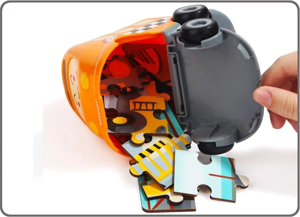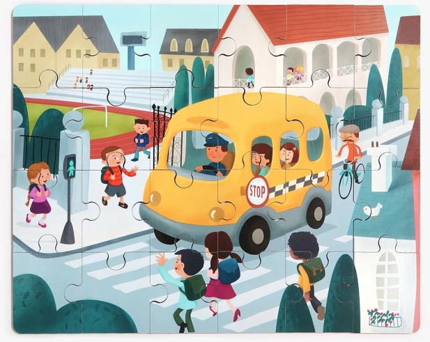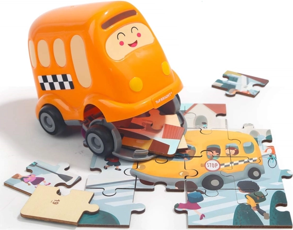 Zabavne in izobraževalne lesene sestavljanke z motivom šolskega avtobusa, skrite v prikupni plastični igrači na kolesih. Sestavljanka ima 24 kosov s številkami na zadnji strani za lažje sestavljanje, spodbuja logično razmišljanje in fino motoriko. Plastični avtobus ima odpirljiv pokrov za shranjevanje kosov in je del mini serije prevoznih sredstev z možnostjo ustvariti panoramsko sestavljanko.