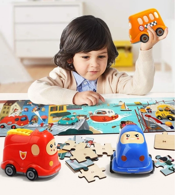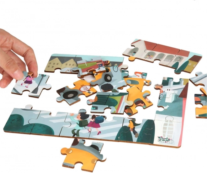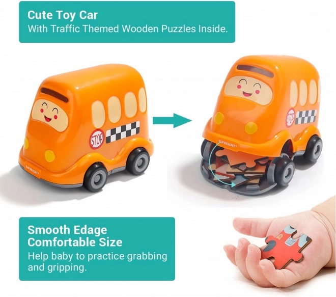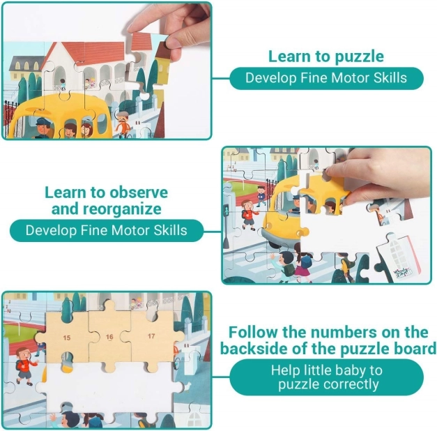 Odkrijte pametno igračo 2 v 1: kakovostne lesene sestavljanke s prometno tematiko in plastični šolski avtobus s shranjevalnim prostorom. Oštevilčene hrbtne strani kosov pomagajo otrokom sestavljati sliko korak za korakom, medtem ko urijo logiko, povezave in motorične spretnosti.