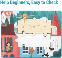 Vsak leseni kos ima na zadnji strani številko. Otroci tako brez nepotrebne frustracije vadijo logiko, računanje in potrpežljivost.