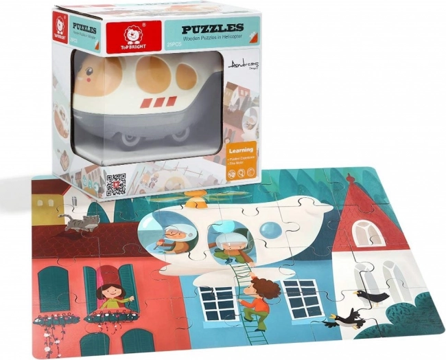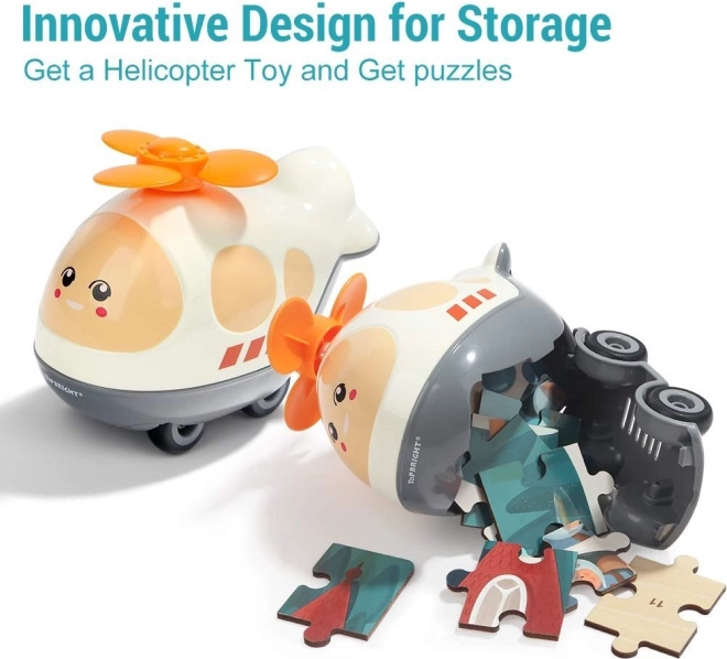 Odkrijte pametno igračo 2 v 1: leseno sestavljanko z motivom prevoznih sredstev in plastični helikopter z odpiralnim pokrovom za shranjevanje kosov in drugih zakladov. Kosi sestavljanke so oštevilčeni, zato se otroci lažje znajdejo, sestavljanje pa je bolj zabavno in poučno.