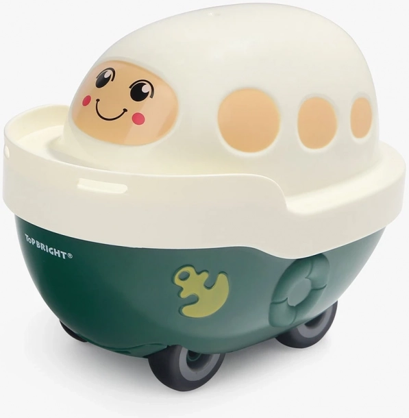 Plastična ladjica s prisrčnim obrazom je povsem funkcionalna igrača. Spodnji pokrov se odpre in sprejme celotno sestavljanko ali druge male zaklade.