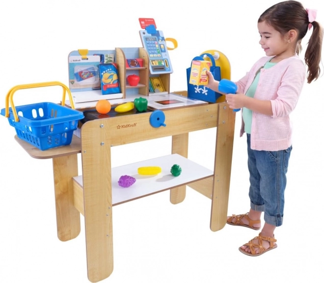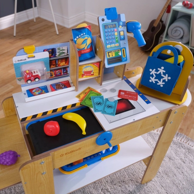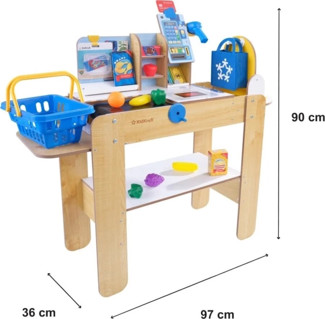 Set vsebuje 30 kakovostnih dodatkov (živila, košarico, kreditno kartico, vrečko, bankovce in kovance) ter vrtljiv stojalo za vrečke kot v pravi trgovini. Lesena konstrukcija KIDKRAFT zagotavlja stabilnost in dolgo življenjsko dobo, zato je idealna za vsakodnevno igro.
