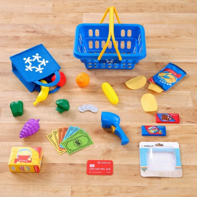 Vključuje igralna živila, košarico, vrečko, kreditno kartico in denar – vse za popolno vlogo blagajnika in kupca.