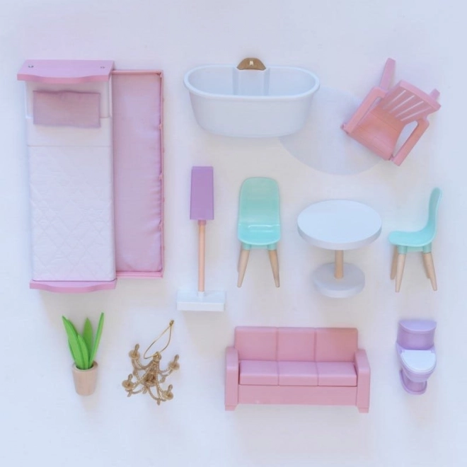 Z dvema nadstropjema, dvema sobama in ločeno kopalnico hišica nudi dovolj prostora za igro s punčkami in dodatki. Priloženih 12 kosov pohištva omogoča, da takoj začnete in po želji spreminjate postavitve.