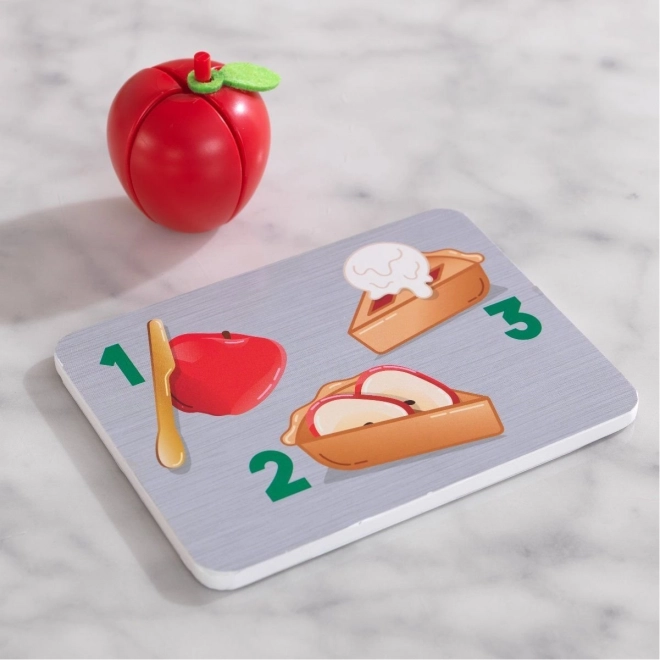Ta ustvarjalni igralni set spremeni otroško kuhinjo v prijetno pekarno. Otroci sledijo vsem korakom priprave – od rezanja jabolk, dodajanja začimb, do sestavljanja pite in postrežbe. Priložena kartica z receptom, ki hkrati služi kot deska za rezanje, vodi male peke korak za korakom.