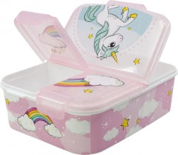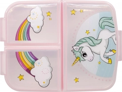 Stilski multi box za malico z veselimi motivi samoroga in mavrice pomaga otrokom ohraniti hrano pregledno ločeno in svežo. Tri samostojne pregrade so idealne za sadje in zelenjavo, sendvič ter majhne priboljške. Trdna konstrukcija prenese običajne padce in udarce, zato je škatla odlična izbira za vsakodnevno uporabo.