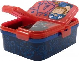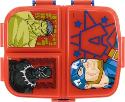 Škatla za kosilo Avengers je izdelana iz trpežne plastike, kar omogoča odpornost na udarce in vsakodnevno obrabo. Dva nivoja omogočata raznovrstno organizacijo obrokov, kjer je glavna komora namenjena večjim jedem, zgornji nivo pa nudi tri ločene predelke za manjše prigrizke.
