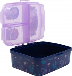 Izviren in praktičen kosilo box z več predali je idealen za otroke, ki ga lahko vzamejo s seboj v šolo, na igrišče ali na izlet. Narejen iz vzdržljivega materiala, prenese običajne padce in udarce pri vsakodnevni uporabi. Box ima dve nadstropji - v spodnjem delu je en velik predal, zgornji del je razdeljen na tri ločene in zapiralne predale.