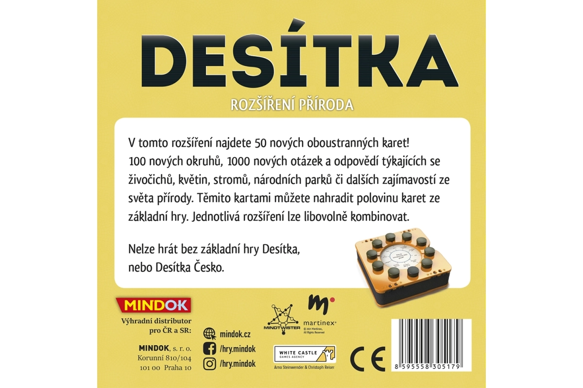 V tej razširitvi najdete 50 novih dvostranskih kart! 100 novih sklopov, 1000 novih vprašanj in odgovorov o državah, mestih, znamenitostih, jezikih in drugih zanimivostih z vsega sveta. S temi kartami lahko nadomestite polovico kart osnovne igre. Posamezne razširitve je mogoče poljubno kombinirati. Vsebina pakiranja: 50 dvostranskih kart OPOMBA: Gre za razširitev. Igranje ni mogoče brez osnovne igre Desetka ali Desetka Češka. Primerno za otroke od 12 let.