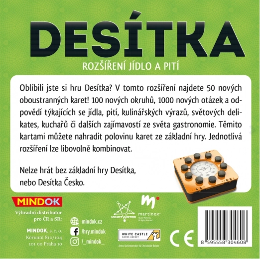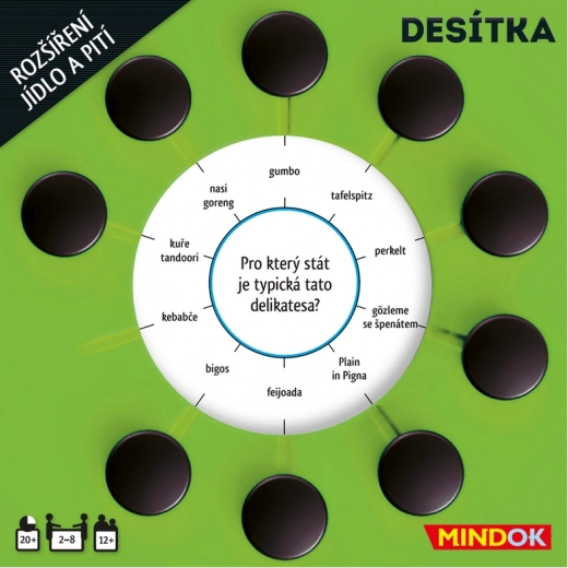 V tej razširitvi boste našli 50 novih dvostranskih kart! 100 novih tem, 1000 novih vprašanj in odgovorov, ki se nanašajo na hrano, pijačo, kulinarične izraze, svetovne delikatese, kuharje ter druge zanimivosti iz sveta gastronomije. S temi kartami lahko nadomestite polovico kart iz osnovne igre. Posamezne razširitve je mogoče poljubno kombinirati. Vsebina pakiranja: 50 dvostranskih kart OPOMBA: Gre za razširitev. Ni mogoče igrati brez osnovne igre Desetka ali Desetka Češka. Primerno za otroke od 12 let.