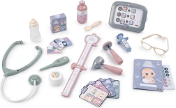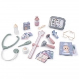 26 dodatkov, vključno s stetoskopom, injekcijo, termometrom, stekleničko in pleničko, podpira domišljijo, empatijo in fino motoriko otrok.