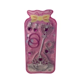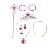 Ta čarobni komplet dodatkov vsakega otroka v hipu spremeni v princesko. Srebrni dodatki z rožnatimi in vijoličnimi srčkastimi kamenčki spodbujajo kreativno in domišljijsko igro vlog ter vsakemu kostumu dodajo slovesen videz.