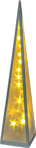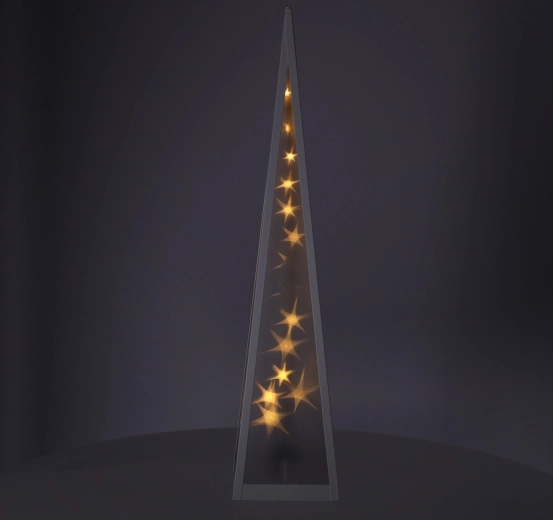 Plastična piramida z belim kovinskim okvirjem, zapolnjenim z zvezdami, ki se premikajo na sredini piramide ✨
