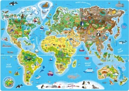 Odkrijte svet iz udobja doma z igrivimi sestavljankami za otroke in odrasle. Geografska sestavljanka z zemljevidom sveta prinaša pregled celin, svetovnih znamenitosti in živali po območjih. Odlična za zabavo in učenje, z ilustracijami slovenskega likovnega umetnika.