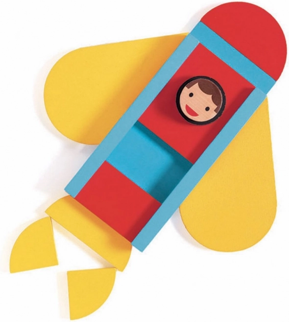 Komplet vsebuje 33 barvnih lesenih kosov različnih oblik, ki spodbujajo otroke, da se igrajo in sestavljajo različna prevozna sredstva.