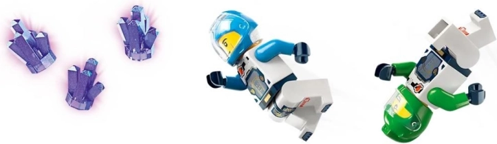 - Bogata oprema: vesoljska ladja, laboratorij, delovišče z žerjavom, meteorit s kristali, 2 astronavta in figurica nezemljana.
