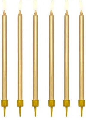Elegantne gladke rojstnodnevne svečke v kovinsko zlati barvi dodajo vaši torti slavnostni videz. Pakiranje vsebuje 12 svečk dolžine 12,5 cm in 12 podstavkov za enostavno namestitev.