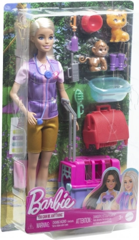 Z garnituro Barbie rešiteljica živali se otroci poglobijo v svet veterinarske oskrbe in reševanja divjih živali. Punčka ima gibljive okončine, nosi praktično terensko opravo in je pripravljena na vsako misijo. Dve mladički – opička in tigrček – čakata na pregled, hranjenje in skrbno nego.