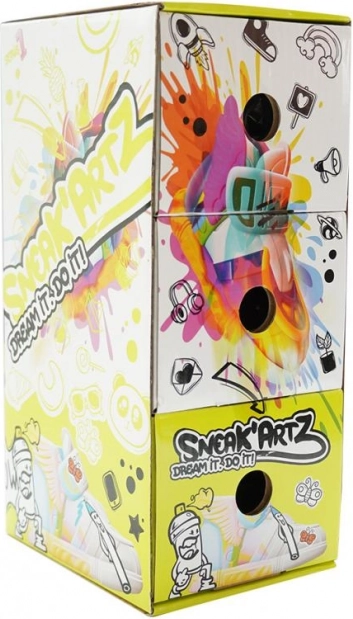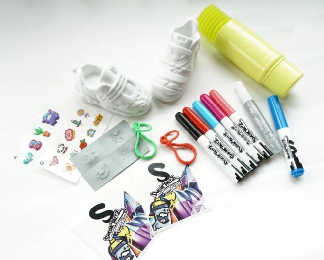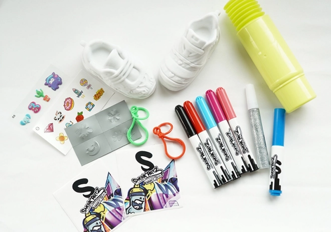 Odkrijte svojo ustvarjalnost s setom Sneak’Artz in oblikujte svoje mini superge po domišljiji. Paket ponuja 2 supergi za okraševanje, bleščice, 6 dekorativnih flomastrov (lahko se uporabljajo tudi kot pihalni), reliefne nalepke, klasične nalepke in obeske. Končane superge lahko obesite na nahrbtnik ali ključe ter zberete do 24 različnih stilov.