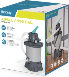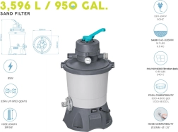 Z kapaciteto 3596 l/h je črpalka idealna za bazene z volumnom od 1.100 do 18.100 litrov. Za delovanje zahteva polnilo iz peska (kremenčev pesek #20, zrnavost 0,45–0,85 mm, približno 8,5 kg) ali visoko zmogljive filtrirne kroglice Polysphere™ v količini cca 240 g.