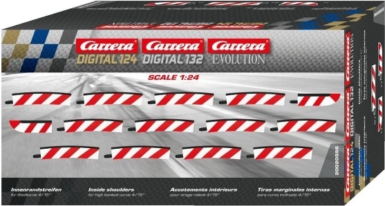 Praktičen komplet notranjih robnikov za prečno nagnjen ovinek 4/15° izboljša stabilnost in tekočnost vožnje na stezah CARRERA EVOLUTION, DIGITAL 132 in DIGITAL 124. V paketu je 12 kosov robnikov s polmerom R4, ki razširijo vožnjo na notranji strani ovinka in povečajo oprijem ter varnost v hitrih odsekih.