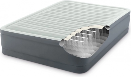 Napihljiva postelja Intex PremAire I v velikosti zakonske postelje (152 × 203 × 46 cm) je idealna izbira za sobo za goste, vikend ali začasno spanje doma. Napredna konstrukcija s tehnologijo Fiber‑Tech in dvojno ojačitvijo sten ter dna zagotavlja visoko stabilnost, vzdržljivost in dolgo življenjsko dobo, medtem ko žametna, rebrasta površina nudi udobje in boljšo cirkulacijo zraka.