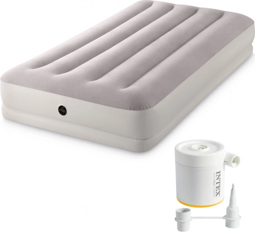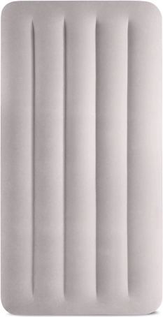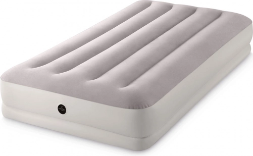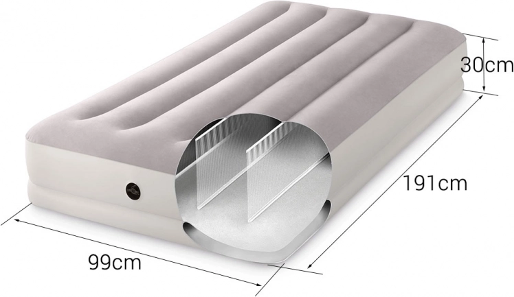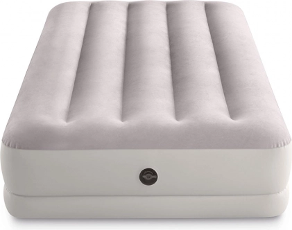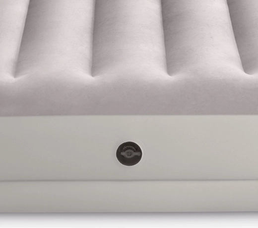 Napihljiva postelja INTEX združuje trpežen PVC material z mehko flock površino, ki je prijetna na dotik in izboljša udobje spanja. Povišana konstrukcija z vzdolžnimi komorami in notranjimi ojačitvami zagotavlja stabilnost brez učinka zibanja ter zanesljivo oporo hrbtenici.