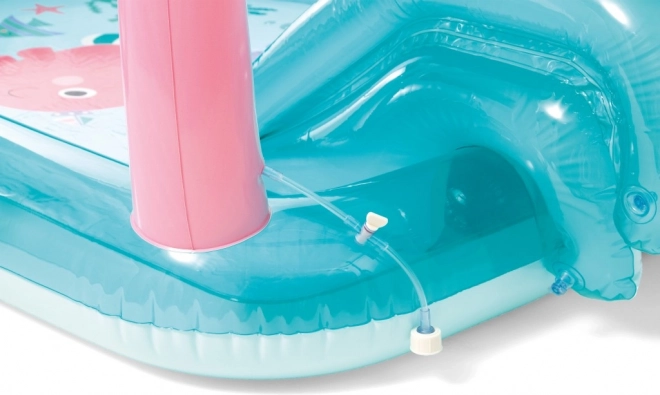 Vgrajen tobogan vodi neposredno v bazenček in spodbuja aktiven gib ter veselje ob vodnih igrah.