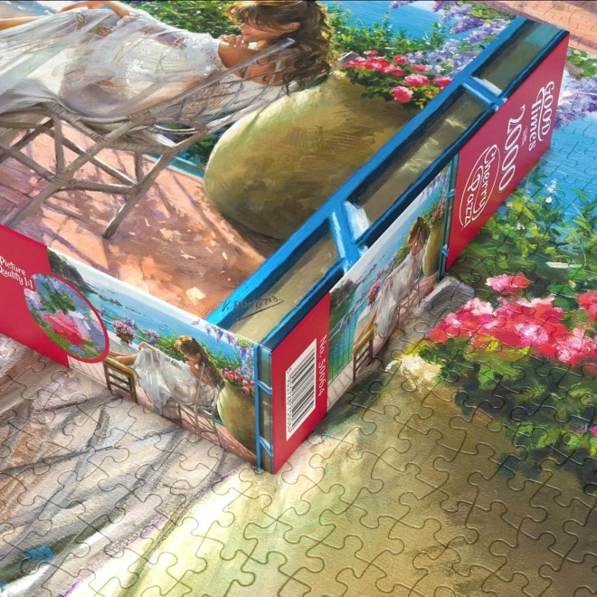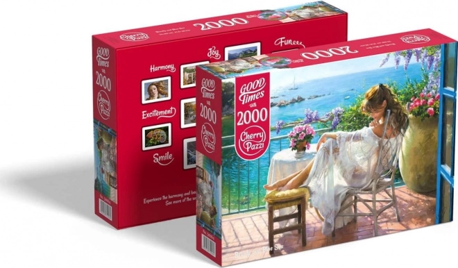 Odkrijte čar mirnega trenutka ob morju. Sestavljanka CHERRY PAZZI prinaša nežno, umetniško sceno ženske, ki počiva na terasi z razgledom na ocean. Z 2000 skrbno izrezanimi kosi je idealna za ljubitelje zahtevnejših izzivov in čudovitih motivov za interier.