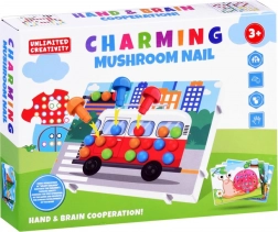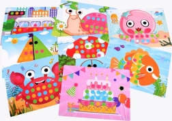 V kompletu je bogata zbirka čepkov in raznoliki motivi (npr. ribica, avtobus ali polž), zato si otroci urijo tudi razlikovanje barv in oblik ter se lahko lotevajo lastnih idej. Zaradi preprostega principa je mozaika idealna za predšolske in mlajše otroke.
