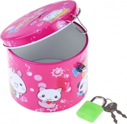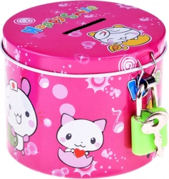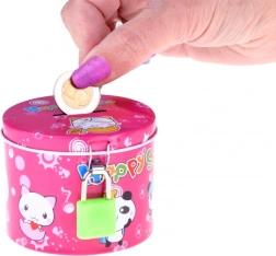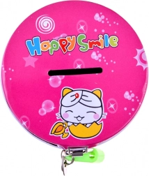 Rožnata kovinska površina z veselimi živalskimi motivi in napisom Happy Smile pritegne otroke ter spodbuja pozitivne navade pri ravnanju z denarjem.