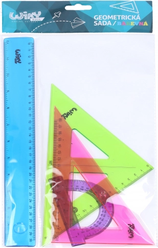- Vsebina kompleta: ravnilo 30 cm (modro), mali kotomer (vijoličen), 2× trikotnik (rožnat in zelen)